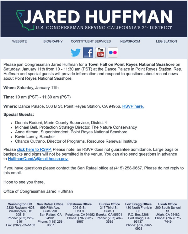 After all, this was to be a Town Hall in name only. The activists had already won. The politicians hovering around the proceedings for the past few years had taken no community input at any time. They had not asked Marin County neighbors how they felt about the forced removal and continuous government persecution of the farmers. Now, with the papers were signed and the ranchers vanquished, Congressman Jared Huffman decided to invite the community for a “discussion.”