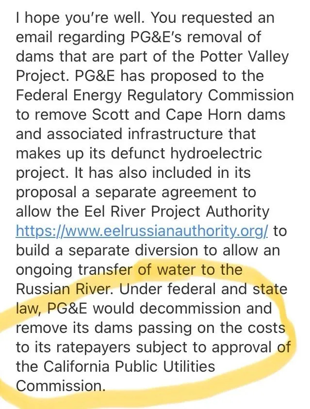 In an email reviewed by UNWON, Huffman’s office said PG&E ratepayers will foot the cost of dam removal, not PG&E.