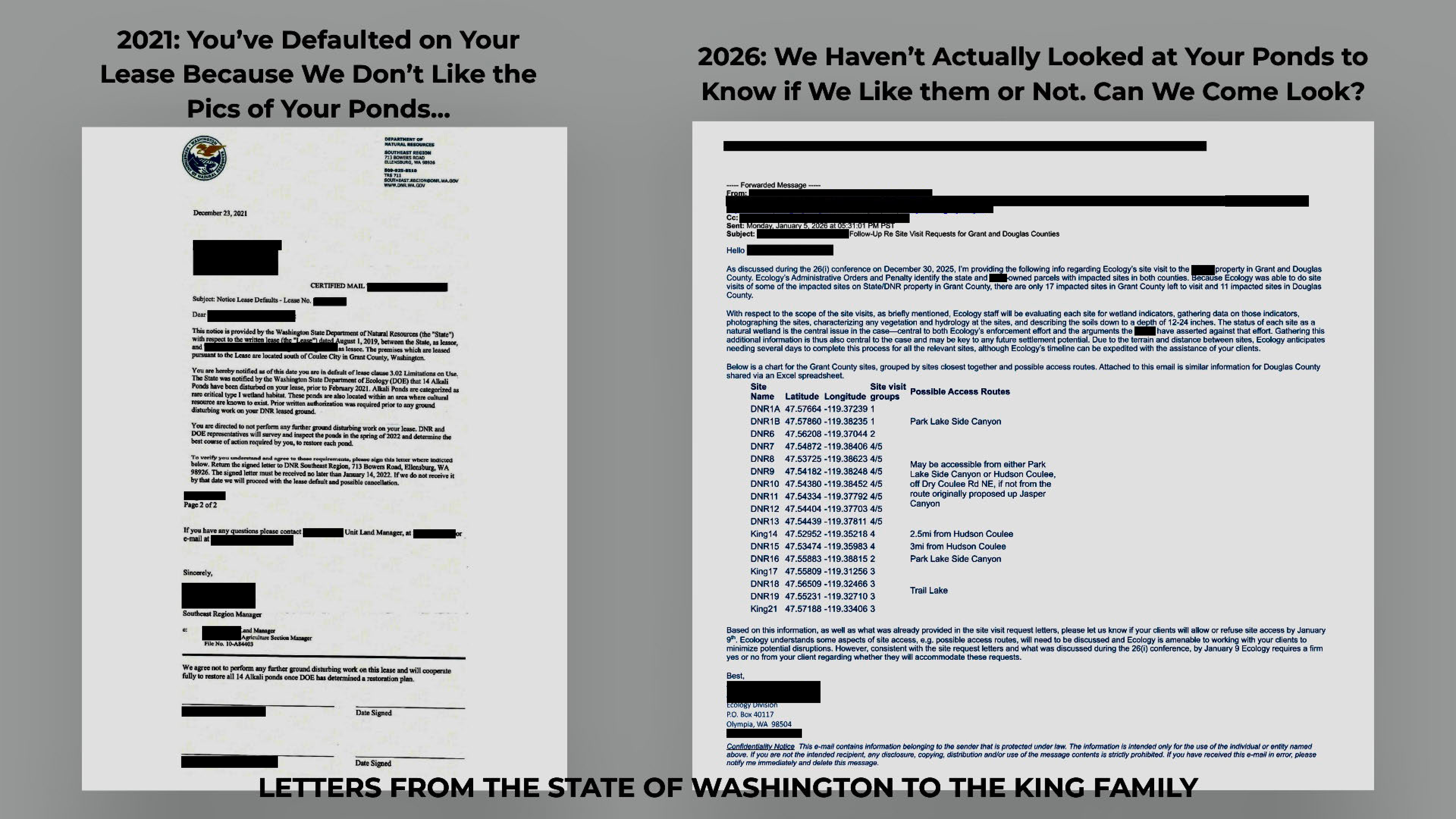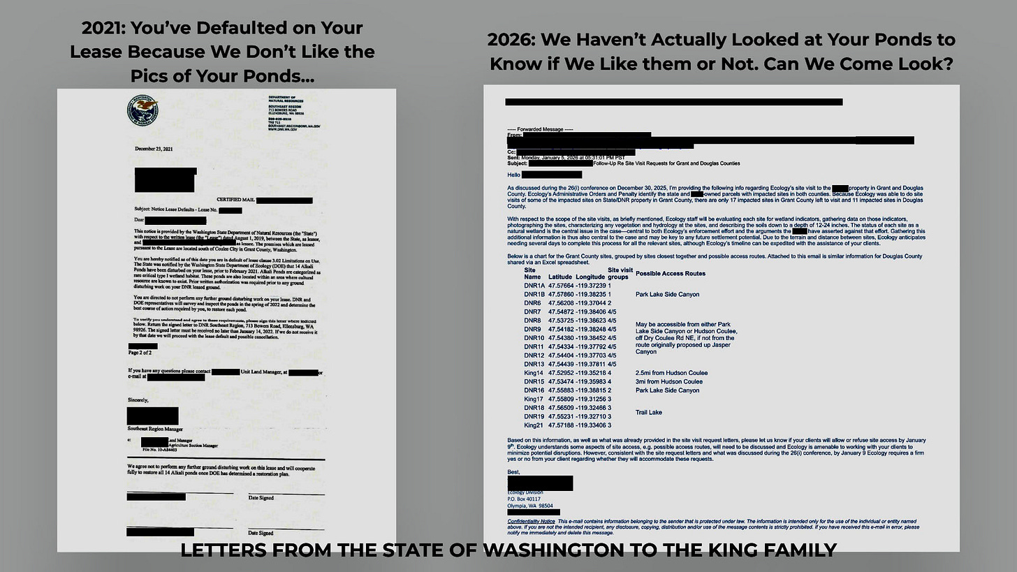 In a January 5, 2026 email obtained by UNWON from a third party—not the Kings or their attorneys—the Washington Department of Ecology (DOE) requests access to the ponds to determine whether they are, in fact, natural wetlands.