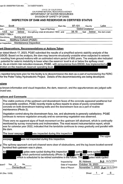 But the report states that a representative from PG&E was contacted. Both reports also quote and concur with spring 2023 evaluations in which Pacific Gas & Electric (PG&E), the Federal Energy Regulatory Commission (FERC), and DSOD judged the dam to be “suitable for continued safe and reliable operation.”