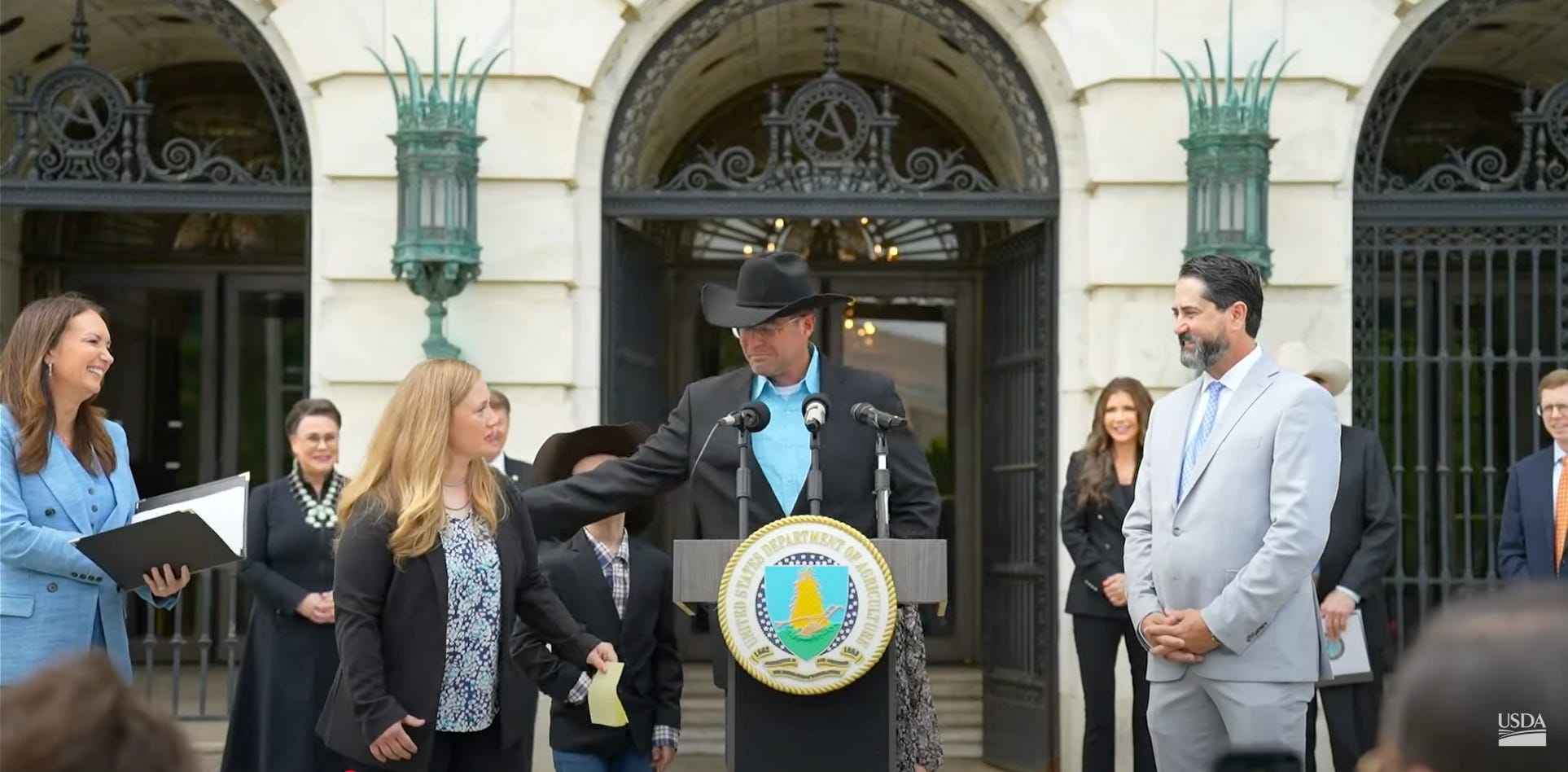 Lawmakers and officials stood with the Maude family Wednesday outside the USDA building in D.C. to announce criminal charges against the young ranchers dropped.