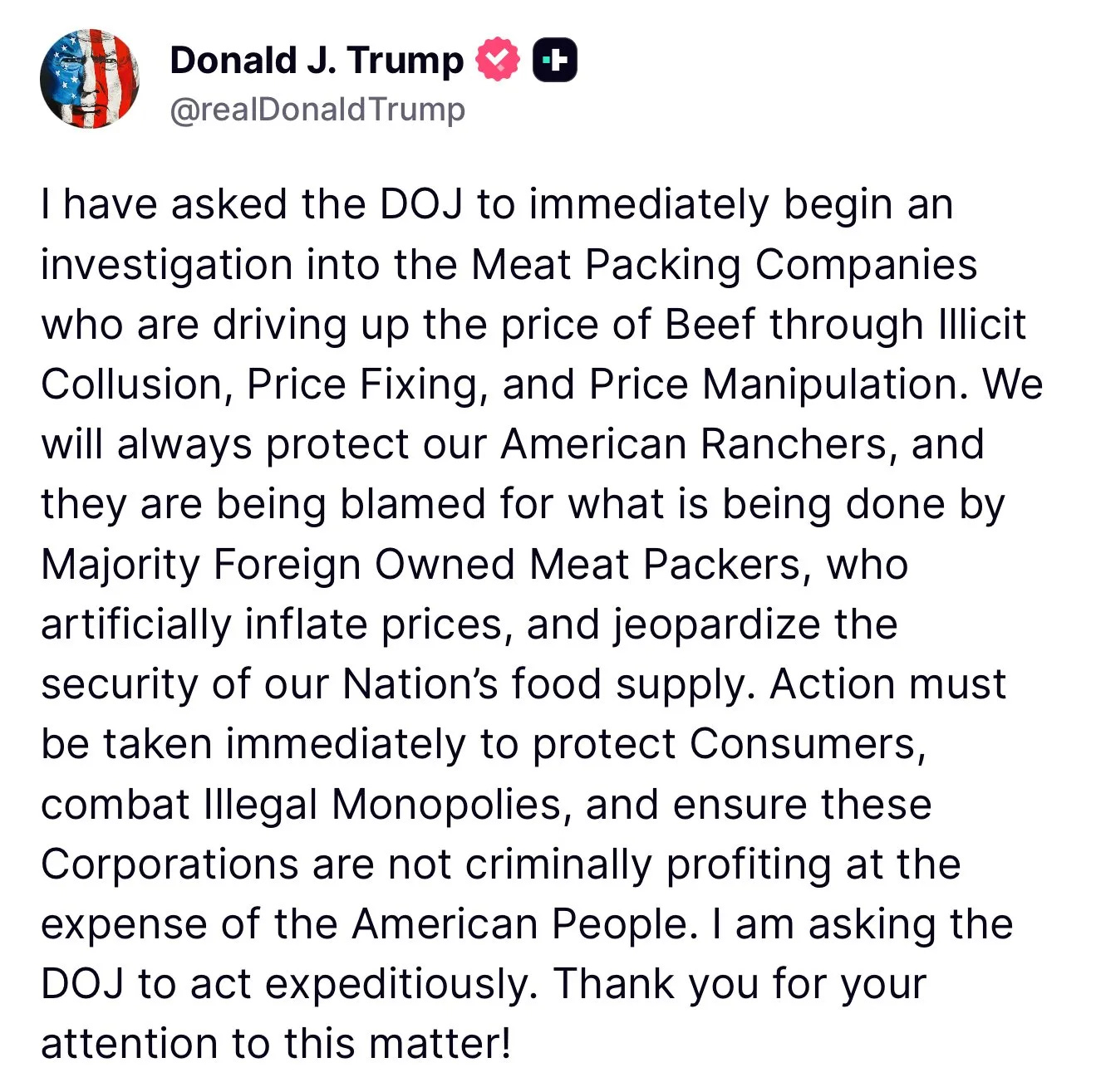 “I have asked the DOJ to immediately begin an investigation into the Meat Packing Companies who are driving up the price of Beef through Illicit Collusion, Price Fixing, and Price Manipulation,” Trump said.