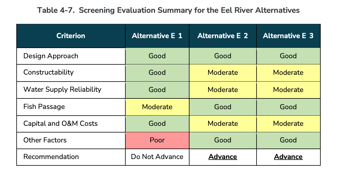 Sonoma Water abandons E-1 despite it being the best alternative for water supply reliability, cost, and construction. The rest of the 453-page report focuses on the two remaining options. The report adds that PG&E has also abandoned E-1.