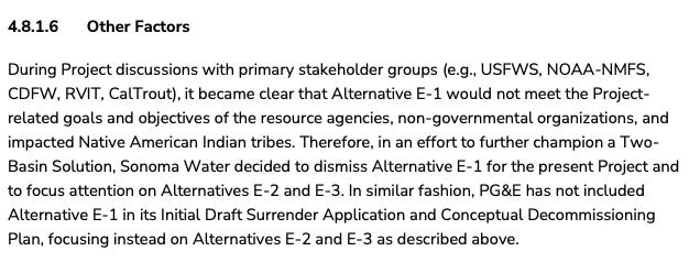 After “discussions with stakeholders,” Sonoma Water abandoned Alternative E-1. The contents of these discussions are not included, and the 600,000 people who will lose their water supply were not represented.
