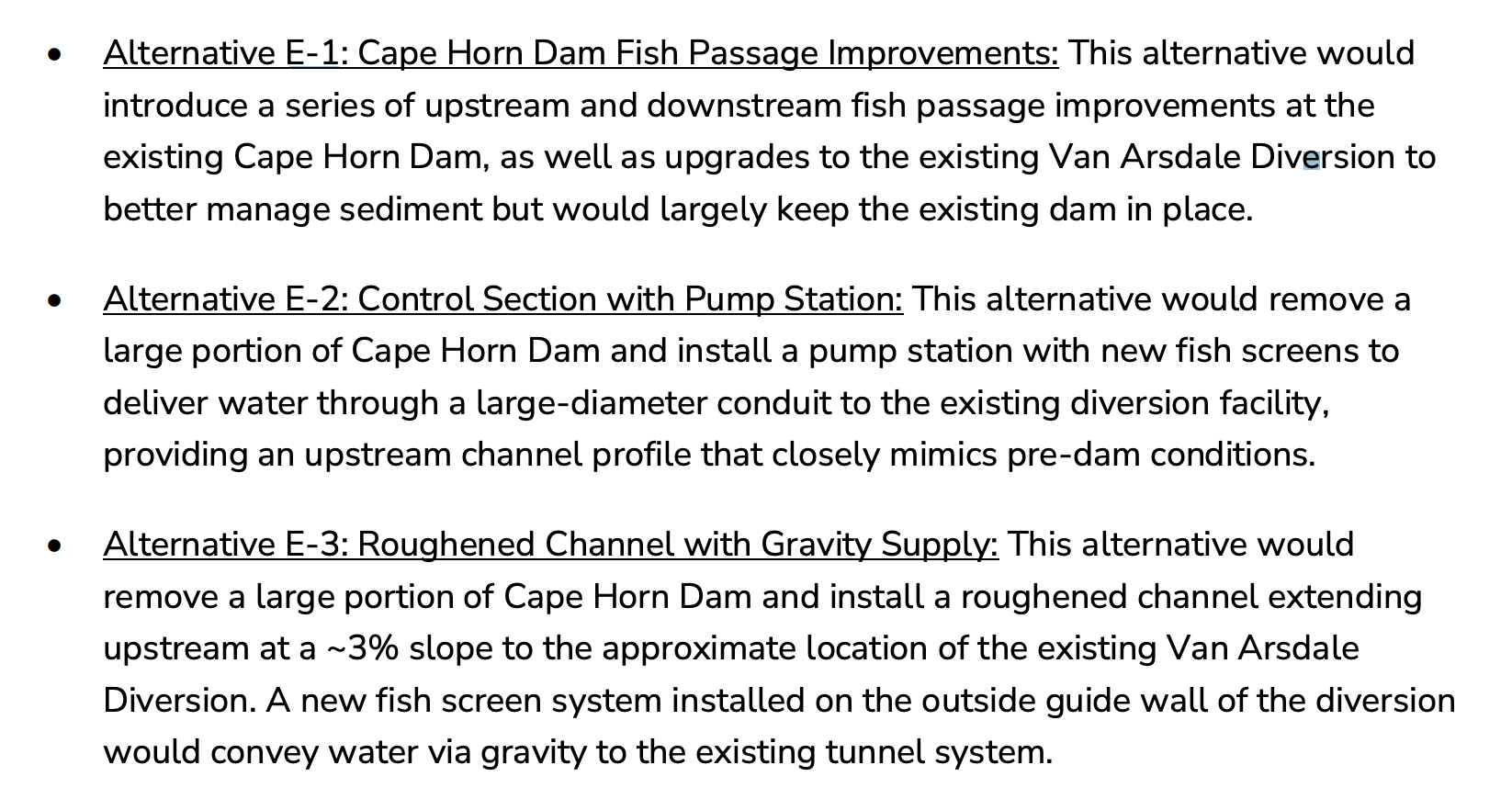The 453-page report examines three alternatives. Alternative E-1 is to upgrade and keep the existing Cape Horn Dam. The other two involve largely removing the dam.