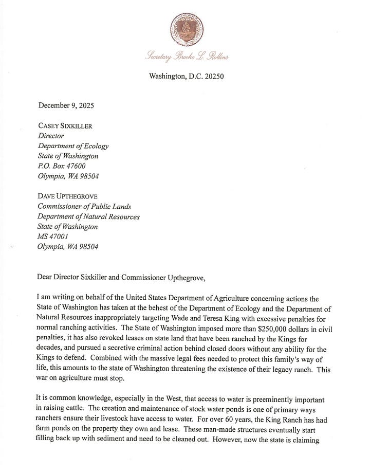 I am writing on behalf of the United States Department of Agriculture concerning actions the State of Washington has taken at the behest of the Department of Ecology and the Department of Natural Resources inappropriately targeting Wade and Teresa King with excessive penalties for normal ranching activities. The State of Washington imposed more than $250,000 dollars in civil penalties, it has also revoked leases on state land that have been ranched by the Kings for decades, and pursued a secretive criminal action behind closed doors without any ability for the Kings to defend. Combined with the massive legal fees needed to protect this family’s way of life, this amounts to the state of Washington threatening the existence of their legacy ranch. This war on agriculture must stop.