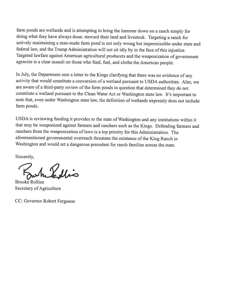 USDA is reviewing funding it provides to the state of Washington and any institutions within it that may be weaponized against farmers and ranchers such as the Kings. Defending farmers and ranchers from the weaponization of laws is a top priority for this Administration. The aforementioned governmental overreach threatens the existence of the King Ranch in Washington and would set a dangerous precedent for ranch families across the state.